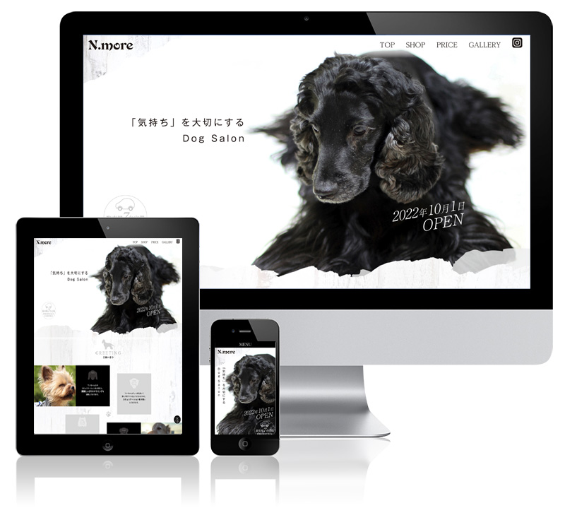 ドッグサロン エヌ・モア様のサイトを新規構築いたしました。 限られた予算の中でデザイン性を重視しつつ、リーズナブルに収まるようシンプルに設計いたしました。